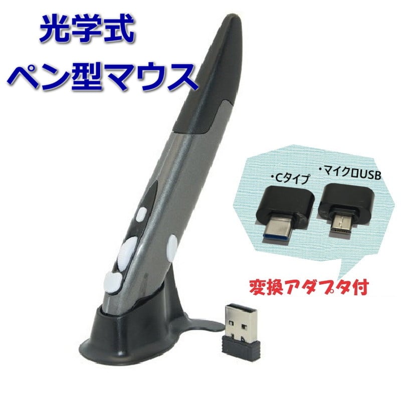 D-180-gy 光学式 ペン型 マウス グレー ワイヤレス 無線 2.4GHz パソコン PC スマホ タブレット タイプC マイクロUSB 変換ソケット付 軽量 持ち運び ペンマウス | DreamRoom BASE
