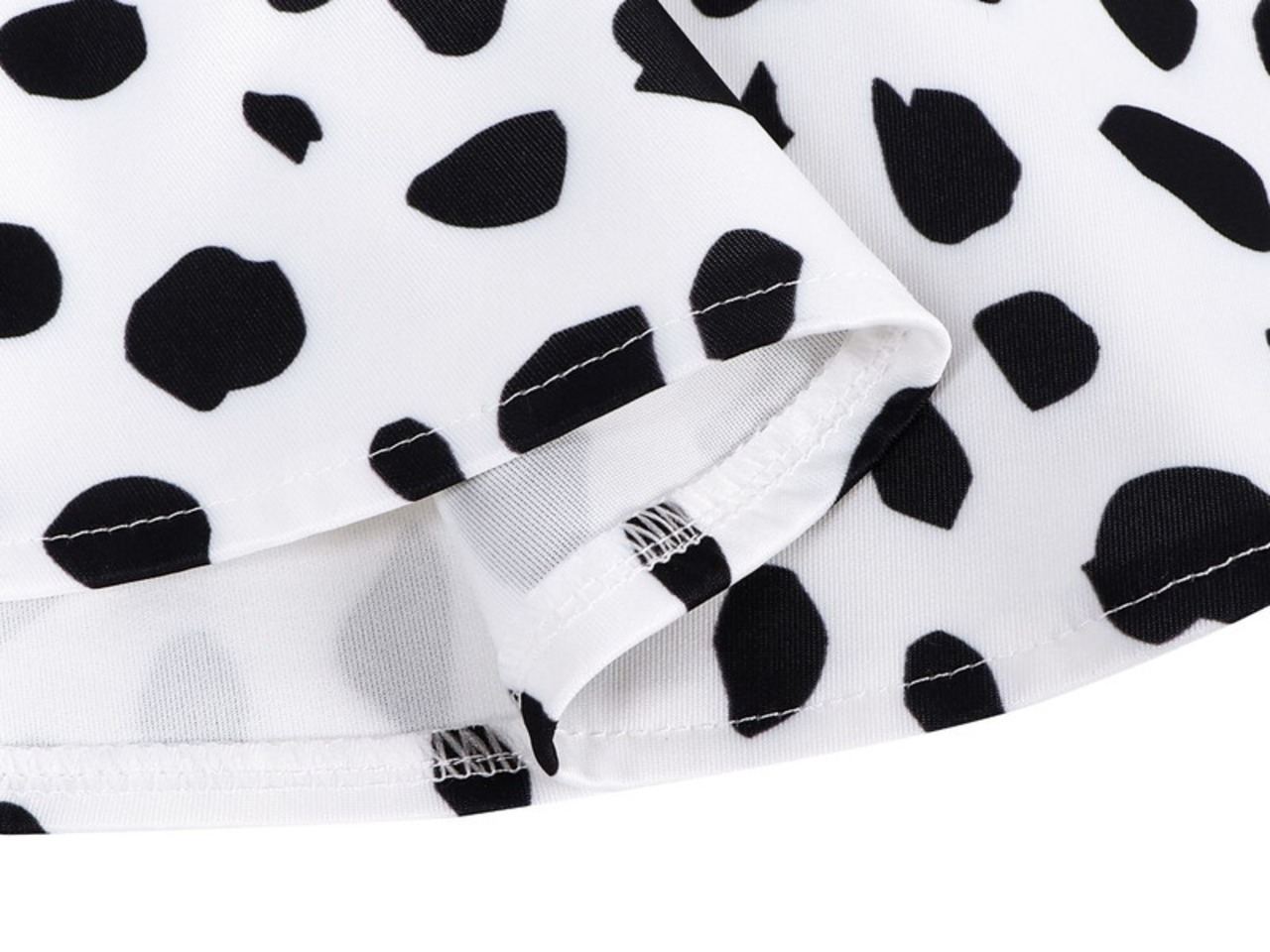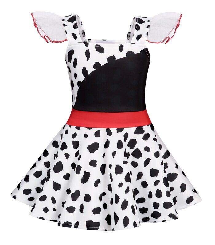 可愛いリトルプリンセスのための特別なコスチュームをご紹介します!黒と白のダルメシアン柄が特徴のワンピースドレスは、女の子が大好きなドット柄デザイン。ハロウィンやコスプレイベントにぴったりなアイテムです!