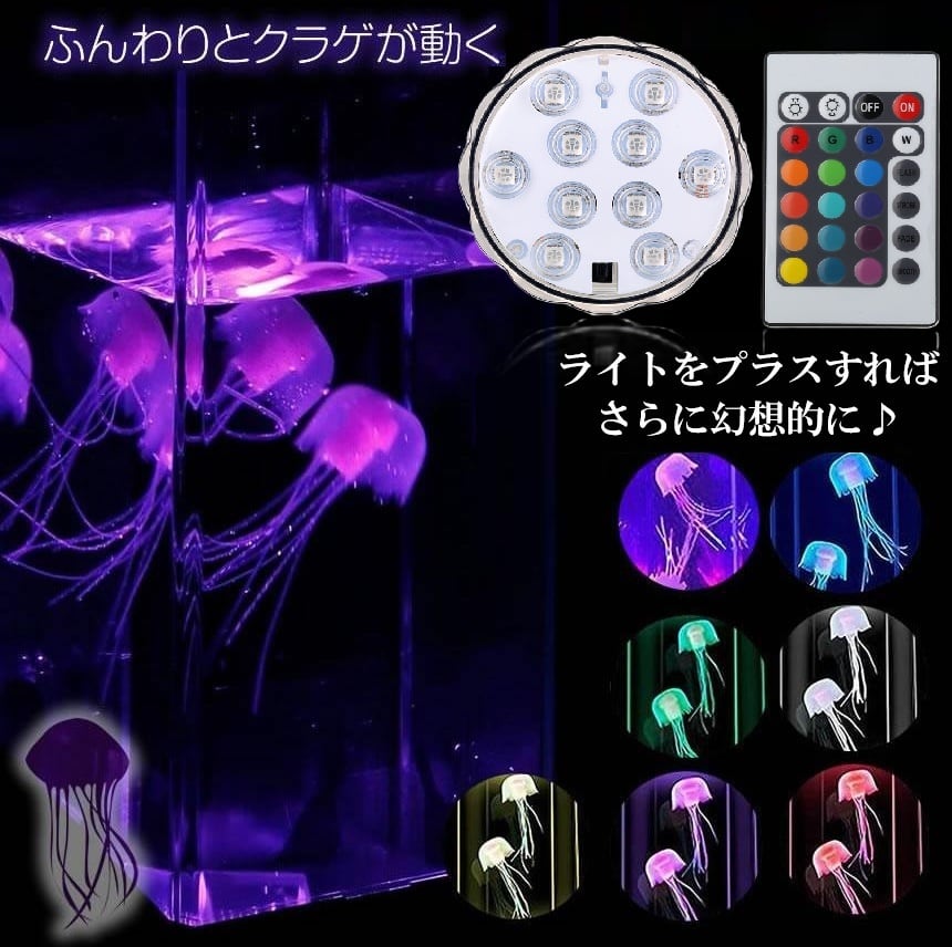 15色のカラーチェンジができるフローティングライトと海月6色がセットになったアクアリウムキッドです。